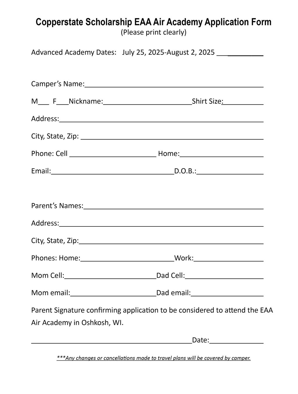 COPPERSTATE FLY-IN, Inc. is accepting applications for the 2025 EAA Air Academy Scholarship in Oshkosh, WI. COPPERSTSTE FLY-IN, Inc. will be sending up to three cadets to the Air Academy. To apply as a candidate for a scholarship the student must: